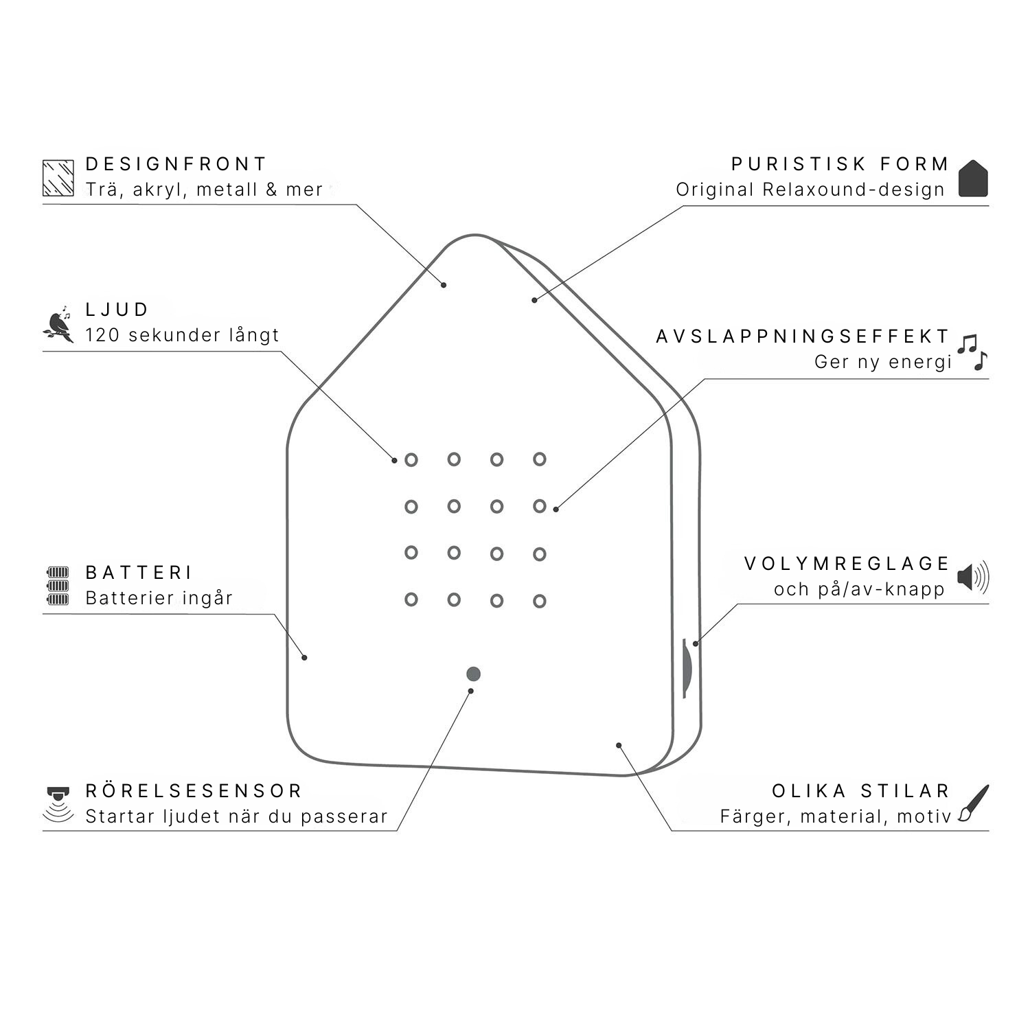 De naturliga ljuden skapar en avkopplande atmosfär och påminner om känslan av att promenera i skogen – ett enkelt sätt att ge både kropp och själ en mikropaus i vardagen. Perfekt i badrum, entré, korridor, gästtoalett eller på kontoret. Ljudboxen kan stå på en hylla eller enkelt hängas upp på väggen.